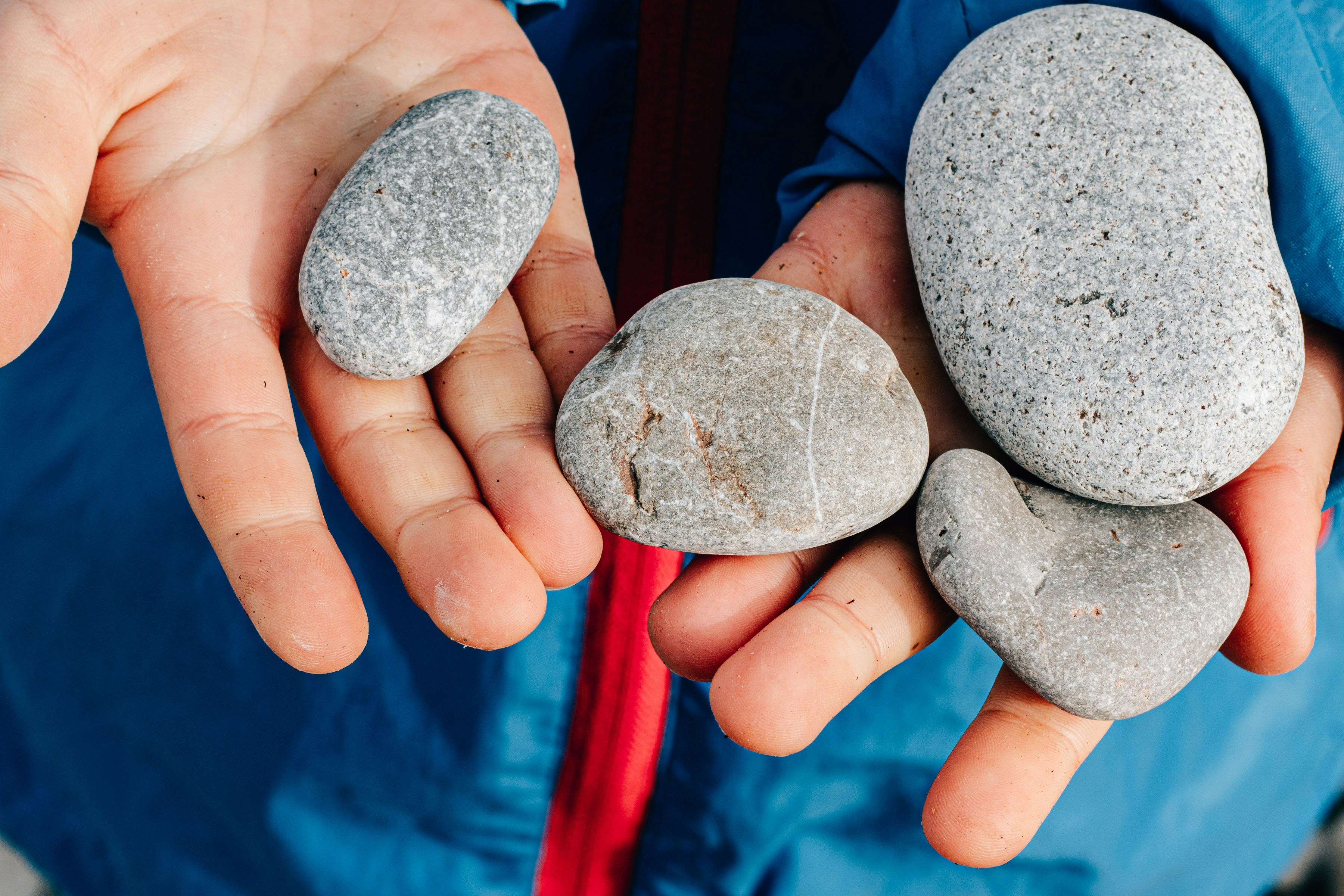 Young person wearing a blue coat holding out four large, smooth, grey beach pebbles standing on a shingle beach in the UK